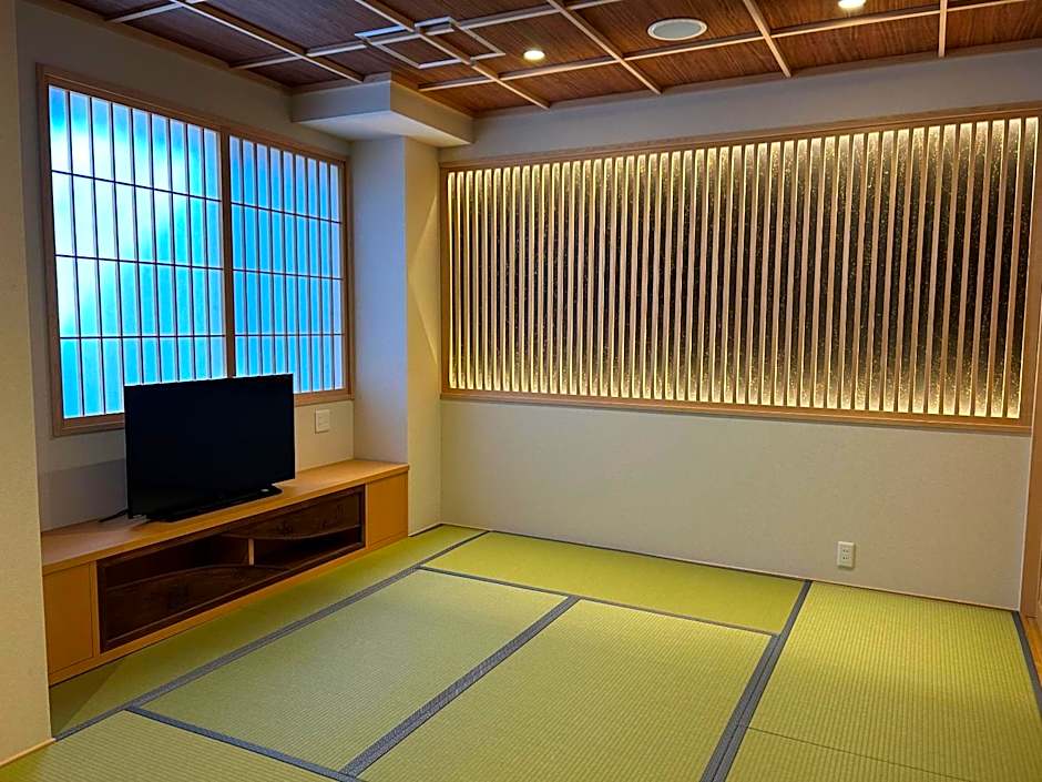The spacious family room features air conditioning, tatami, as well as a private bathroom boasting a bath and a shower. The unit has 10 futons.
